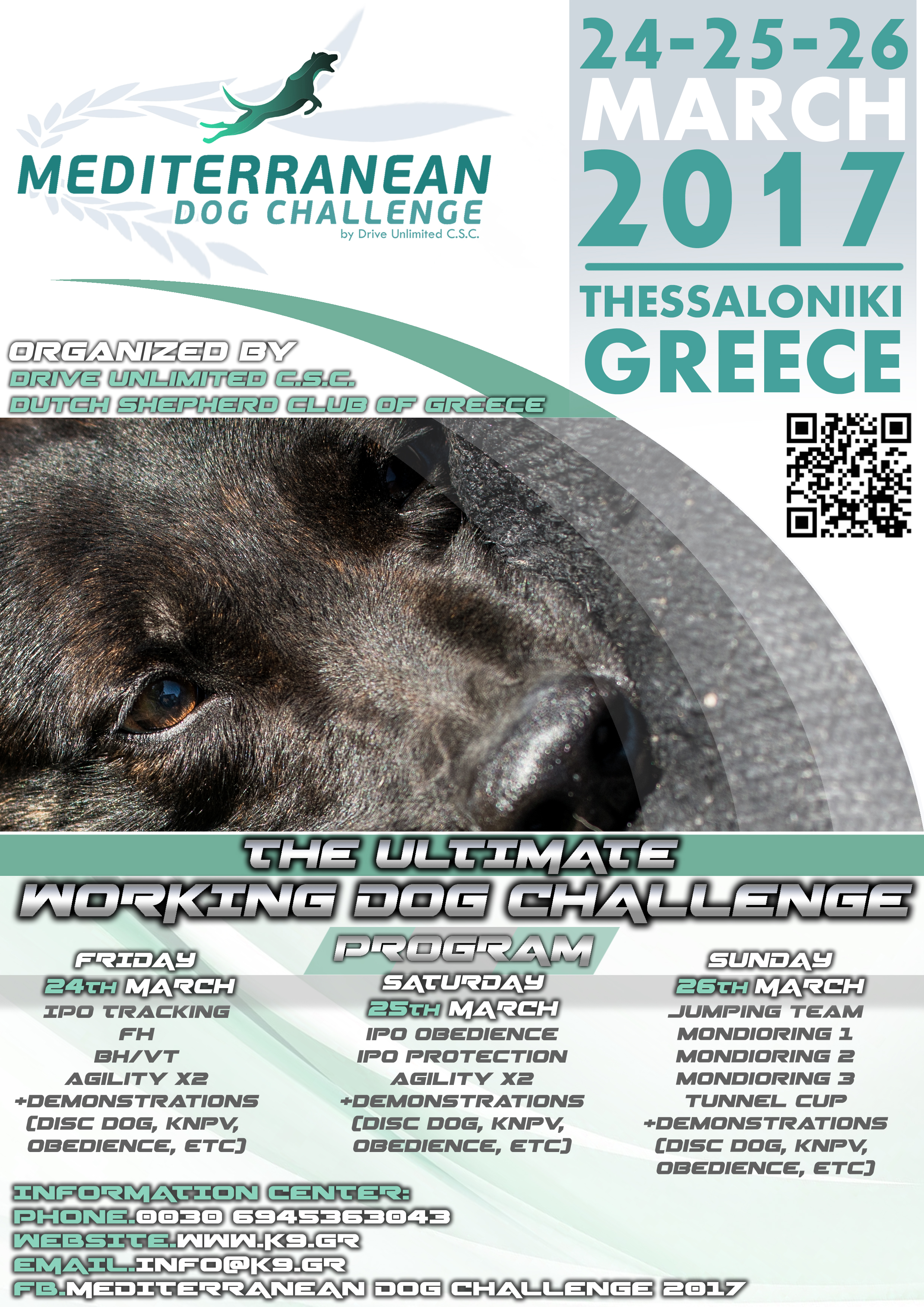 What is the Mediterranean Dog Challenge? Mediterranean Dog Challenge is the ultimate Mediterranean dog sport challenge/contest. The event is finally a fact and came to shake up the world of dog-sport starting its premiere in Greece - March 2017! For the first time in Greece such a unique event featuring dog sports. Many different sports -as Mondioring, IPO, Agility-, competitors from foreign countries, shows with trained dogs, big prizes, impressive organization, festive atmosphere, presentation of new dog sports, kiosks with dog accessories and dog food, information from animal welfare organizations, raffles and much much more at the unique Mediterranean Dog Challenge. Mediterranean Dog Challenge began as an idea in 2015 with a double agility competition under the name of "Cup of the North". The organization back then made great sense to both domestic participants and spectators as well as to foreigners, annotated as probably the best organization of dog sport content in Greece. This year, therefore, the team of Drive Unlimited Canine Sports Center decided to bring the event to a whole new level and to institutionalize in the future as the largest and brightest dog sport festival in the wider region of the Mediterranean. The name of this festival comes from the country of its origin, Greece, which is the first thing that comes to everyone's mind on hearing the word mediterranean. Organizers of this event are Drive Unlimited - Canine Sports Center (www.k9.gr) and Dutch Shepherd Club of Greece. Judge Agility : Christian Görl (Germany) Agility competitions will be qualifying competitions for the world championship of Dutch Shepherds 2017 in Germany. Friday and Saturday will be held 2 agility competitions in all levels (A0,A1,A2,A3) and Sunday will be held a Jumping Team and Tunnel Cup.