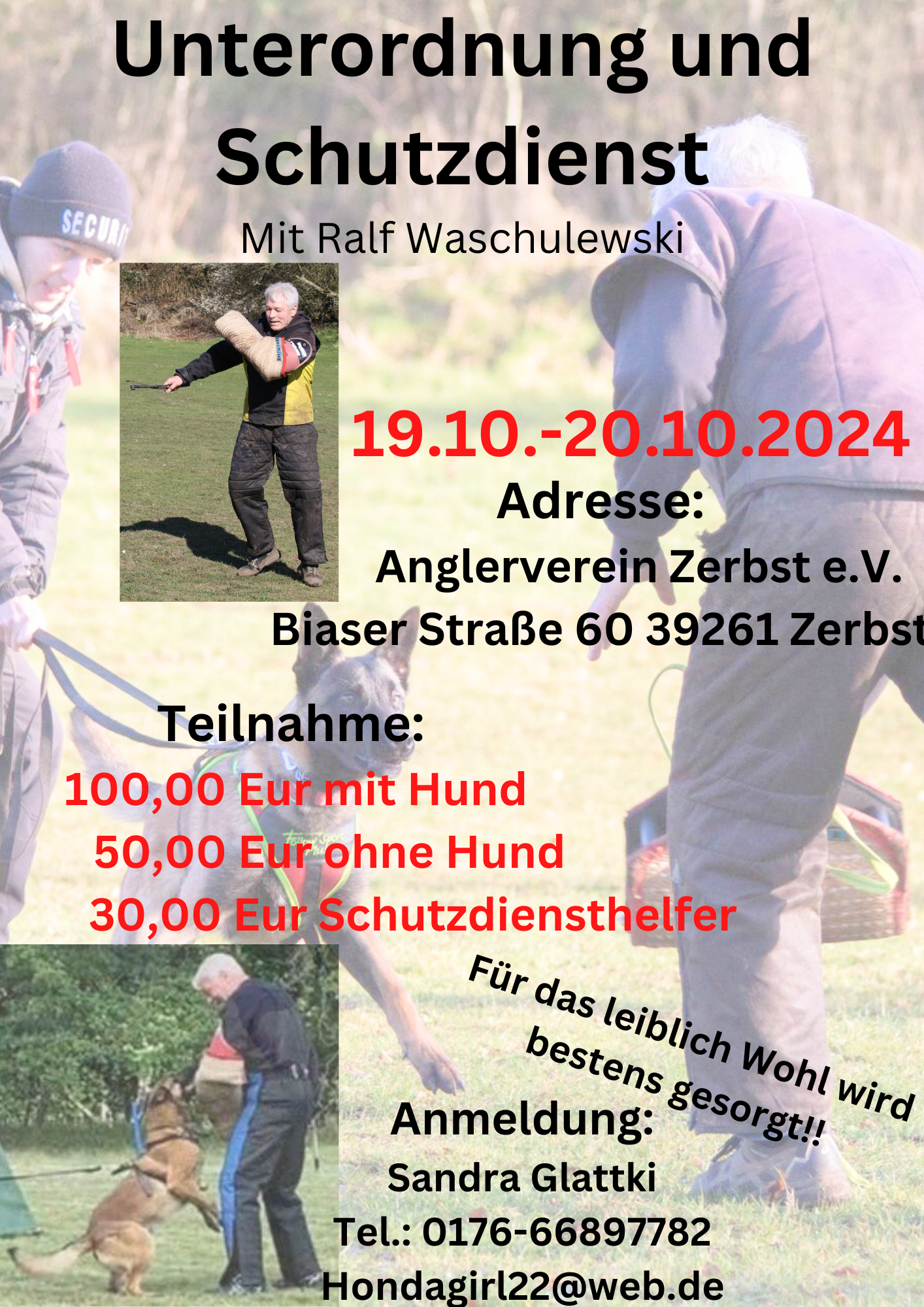 Der Anglerverein Zerbst e.V. veranstaltet vom 08.06.-09.06.2024 ein Schutzdienst und Unterordnungsseminar mit Ralf Waschulewski.Ralf ist ein erfahrener Hundesportler,der uns bei seinem Schutzdienstworkshop mit seinen Tipps und Tricks weiterhelfen möchte.Egal ob du selber Hundeführer/in oder Schutzdiensthelfer/in bist,bei diesem Workshop ist für jeden was dabei.