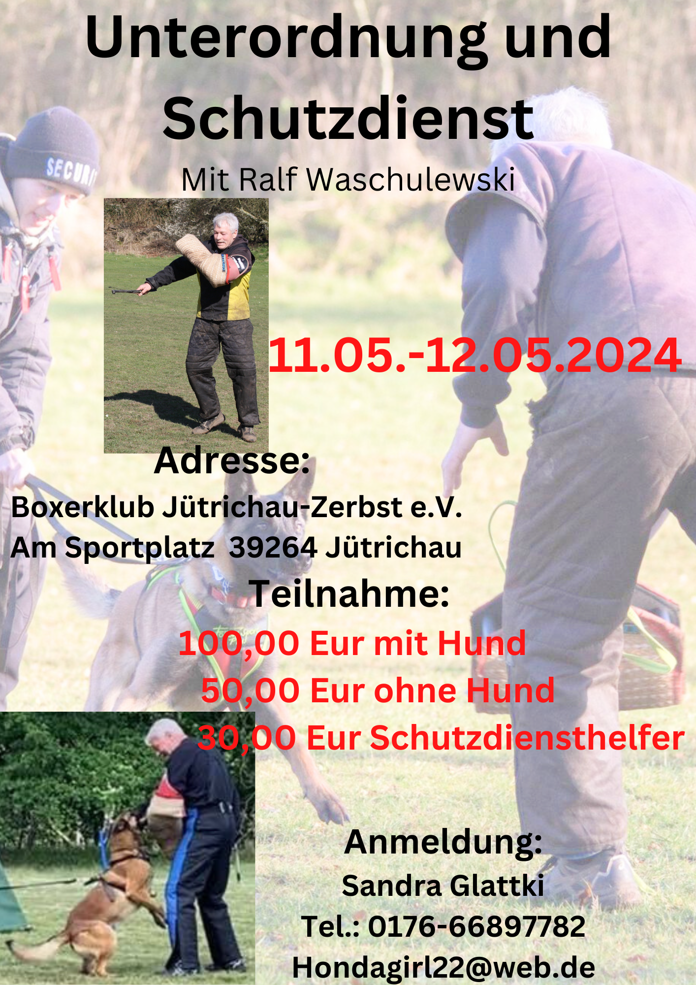 Der Boxerklub Jütrichau veranstaltet vom 11.05.-12.05.2024 ein Schutzdienst und Unterordnungsseminar mit Ralf Waschulewski.Auch du möchtest neue Sichtweisen im Hundesport erlernen und neue Trainingsansätze mit auf deinen Weg bekommen?Dann bist du hier genau richtig.Ralf ist ein erfahrener Hundesportler,der uns bei seinem Schutzdienstworkshop mit seinen Tipps und Tricks weiterhelfen möchte.Egal ob du selber Hundeführer/in oder Schutzdiensthelfer/in bist,bei diesem Workshop ist für jeden was dabei.
